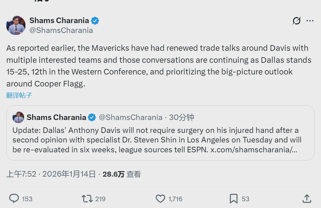 北京时间1月14日上午8点,NBA名记Shams报道,独行侠内线安东尼-戴维斯在洛杉矶接受了医学专家的第二次诊断,专家认为他受伤的手不需要手术,AD将在6周后再次接受评估。与此同时,独行侠已经跟其他球队重启交易谈判。